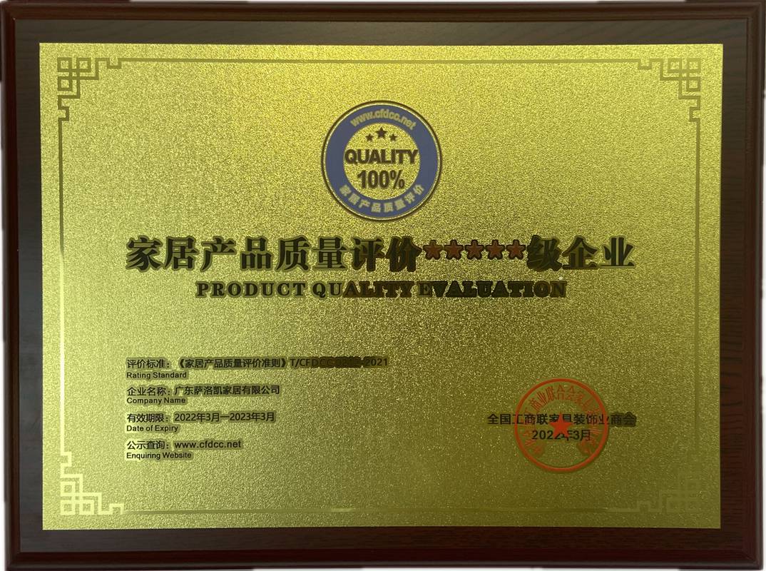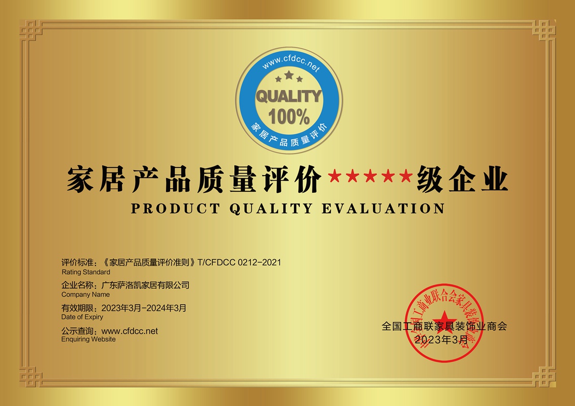 家居產(chǎn)品質(zhì)量評價5星級企業(yè)有效期至2024年